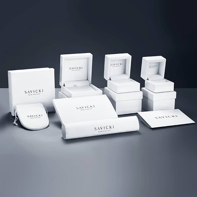 Всеки поръчан продукт е внимателно опакован до съвършенство и изпратен до Вас. Във пратката ще намерите: Елегантна кутийка за подарък, съобразена с размера на закупените бижута, торбичка за подарък, сертификат за качество, доживотна гаранция (ако е приложима), гаранция за сватбен пръстен (ако е приложима) и кърпичка за почистване на бижута – всички елементи са в стилна фирмена кутия SAVICKI.